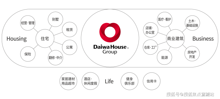 目前,集团经营事物的规模涉及独栋别墅、高端公寓、工业化住宅开发,民用及商业建筑的研究开发、设计、建设、销售及售后服务管理,大规模综合商业体、家居建材超市的建设,物业管理,旅游(商务宾馆、度假酒店经营),物流,医疗看护,环境能源等多个事业领域。