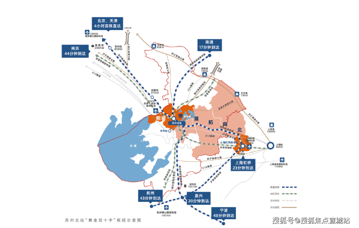 “黄金双十字”枢纽,1.5小时城际交通圈,与上海虹桥枢纽共同打造国家级高铁复合枢纽,13站台30线,促进沪苏协同。